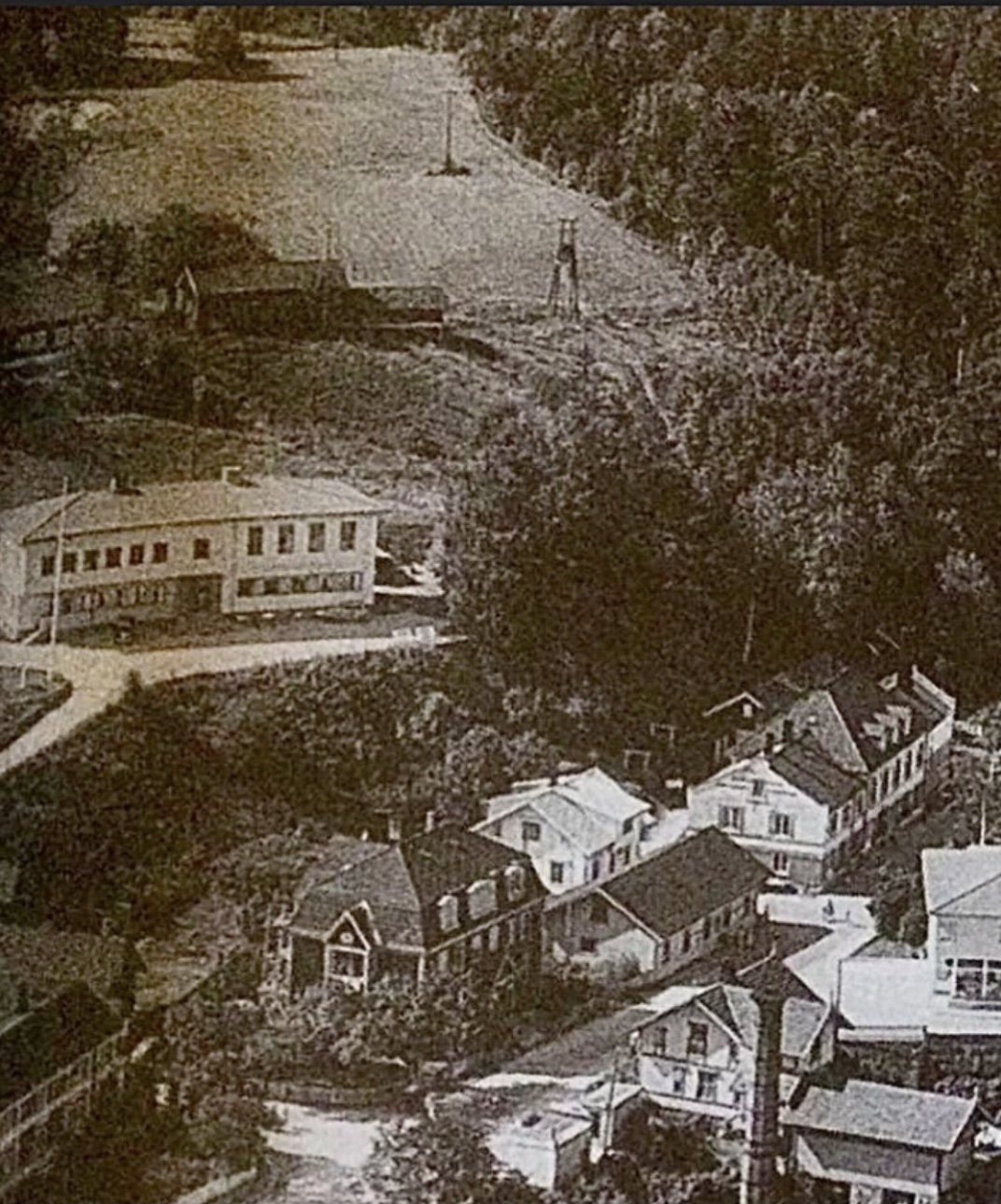 Etter 1935. Bakken hadde store jorder og enger. Holden Forbrugsforening sitt første bygg ser vi mellom posthuset og Gamlebanken nærmast veien.