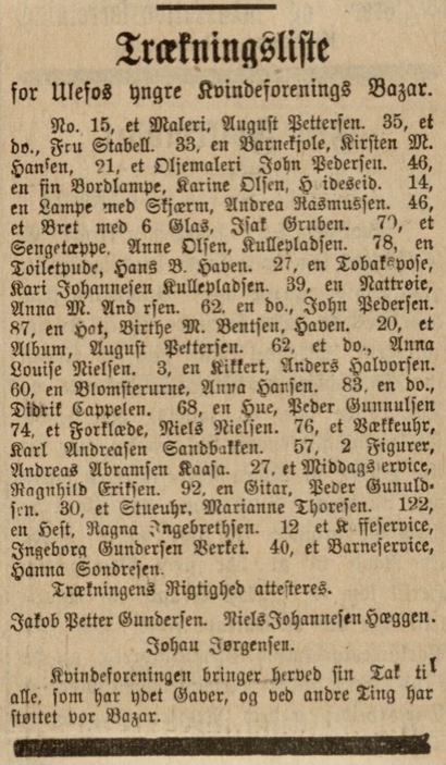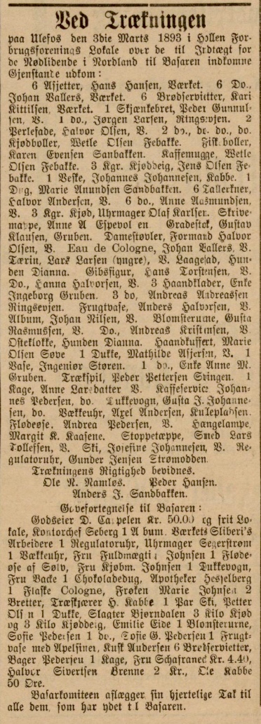 Før jula 1892 holder «Ulefos Yngre Kvindeforening» basar. Her ser vi de heldige vinnerane og to av dissa budde i vårt område.