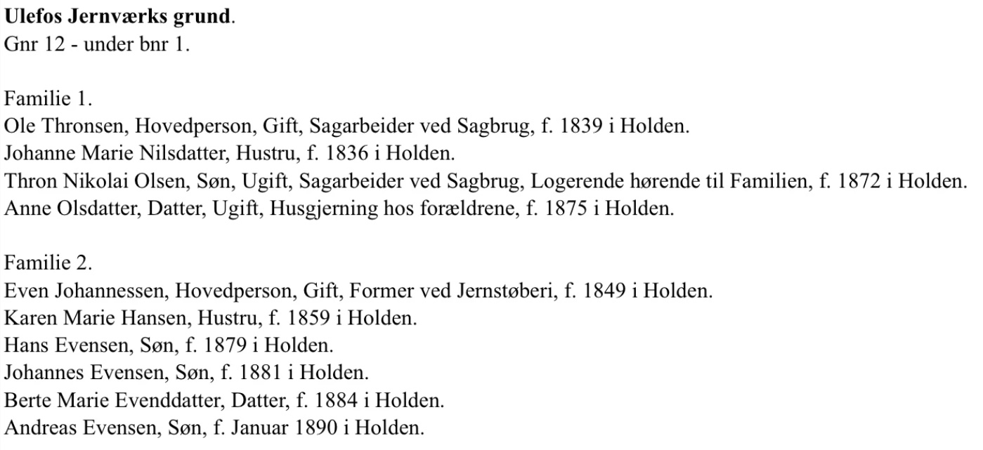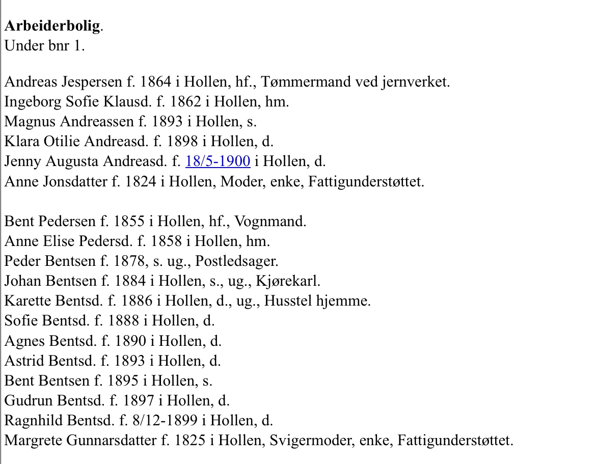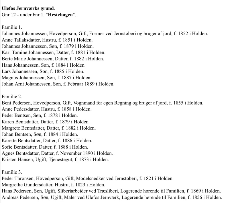 Da jernverket starta opp, blei arbeiderboligane først bygd nære jernverket og da inne i dagens park i Holden. Siden blei nye bygd ved behov. Fellesbetegnelsen på detta området va Hesthagan. Da området ekspanderte, blei det delt i øvre- og nedre Hesthagan. Navnet kom av at her gjekk jernverkets hestar og beita og her stod de på stall. I området Kullplassen har det da tidlig budd fleire familiar i ulike hus og de har budd tett på hverandre. Detta området har da vært ein gammal plass, eller Gamleplass som noen kalte området seinare.