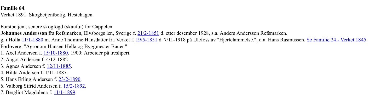 Axel er 12 år da han vinner. Han va sønn av Cappelen sin skaufut, Johannes Andersson. De budde i skogbetjentboligen som lå på Kullepladsen og området hette Hesthagan.