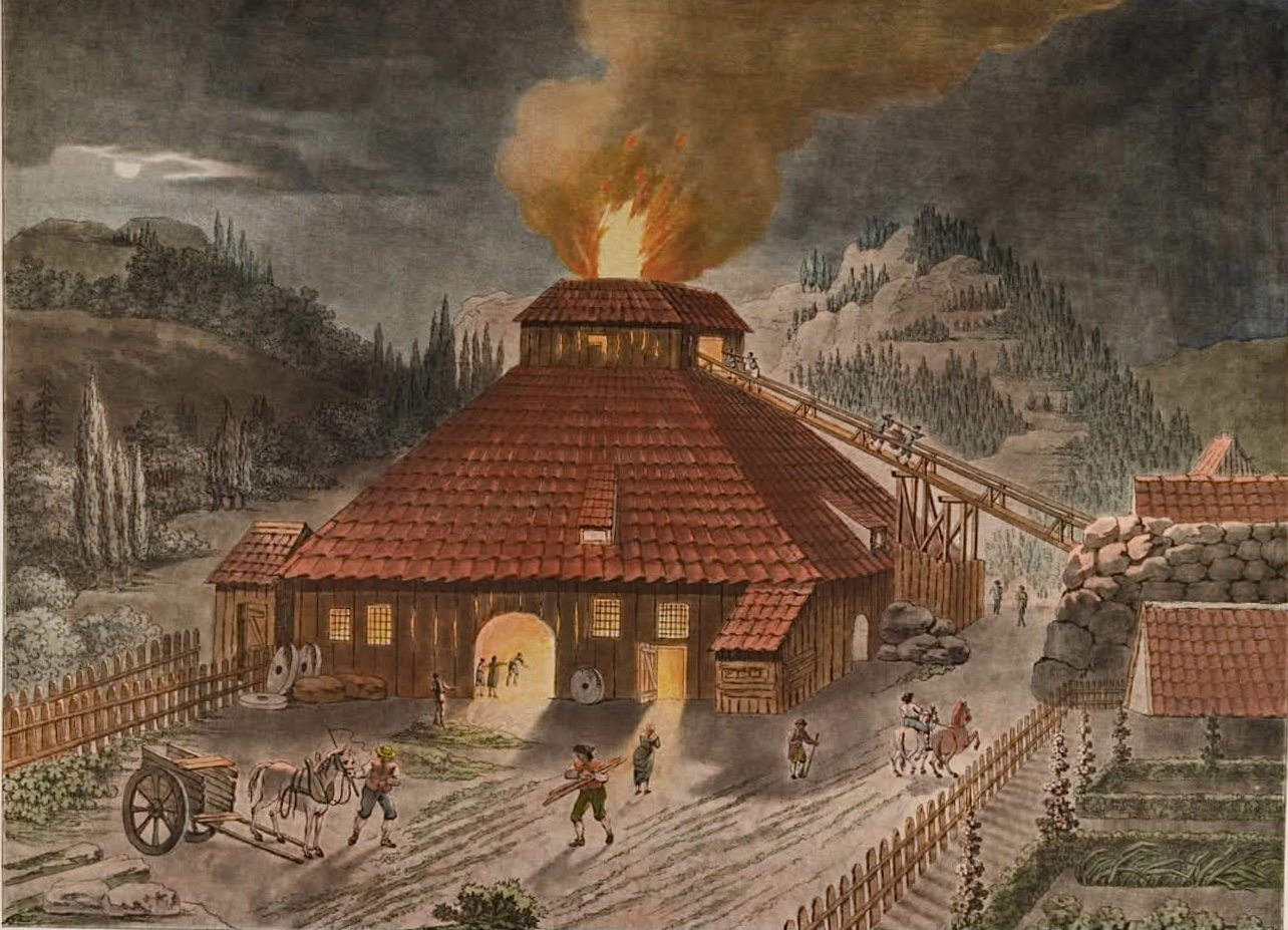 Her ser vi marsovnen på Bærum Jernverk fra rundt 1790. I dag er bokstaven «r» stum i uttale og skrift og ordet masovn blir brukt når gammal framstillingsprosess av råjern ska beskrivas.