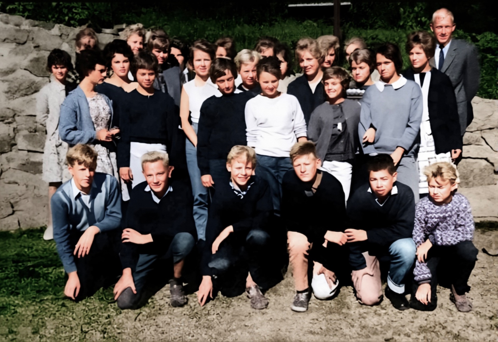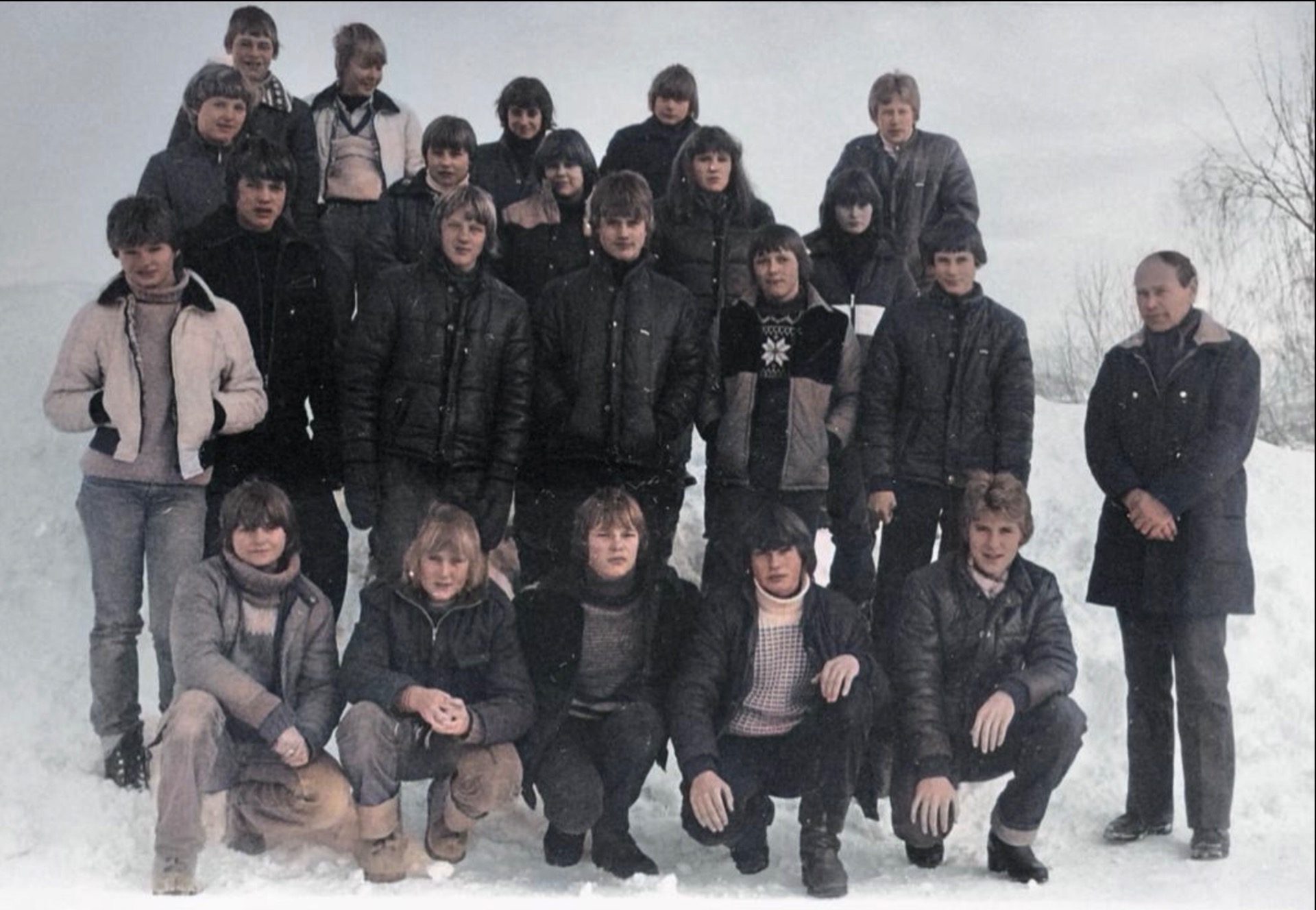 8B vinteren 79/80 og vår klasseforstander Gjermund Kile. Han har akkurat feira sin 90 års dag og er litt dårlig te beins, men hue er like skarpt som det alltid har vært. Gjermund kjørte også skolebussen og han imponerte med spenst og styrke: Nede i gymnastikksalen blei tjukkasser, tau og anna utstyr bruka. Taua hang i taket og kunne draes ut i salen. Gjermund tok tauet og klatra etter bare hendane heilt opp med beina rett ut samla! Det kunststøkket er det ikke mange som gjør etter ham!