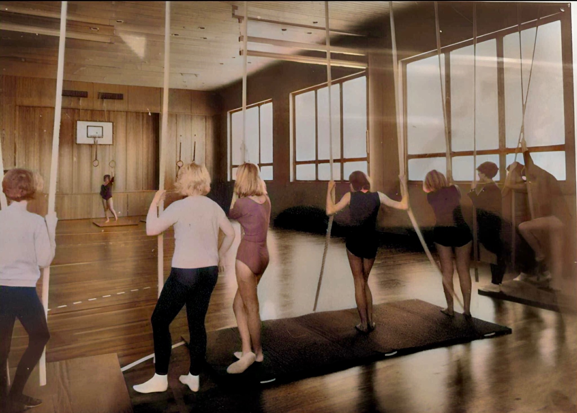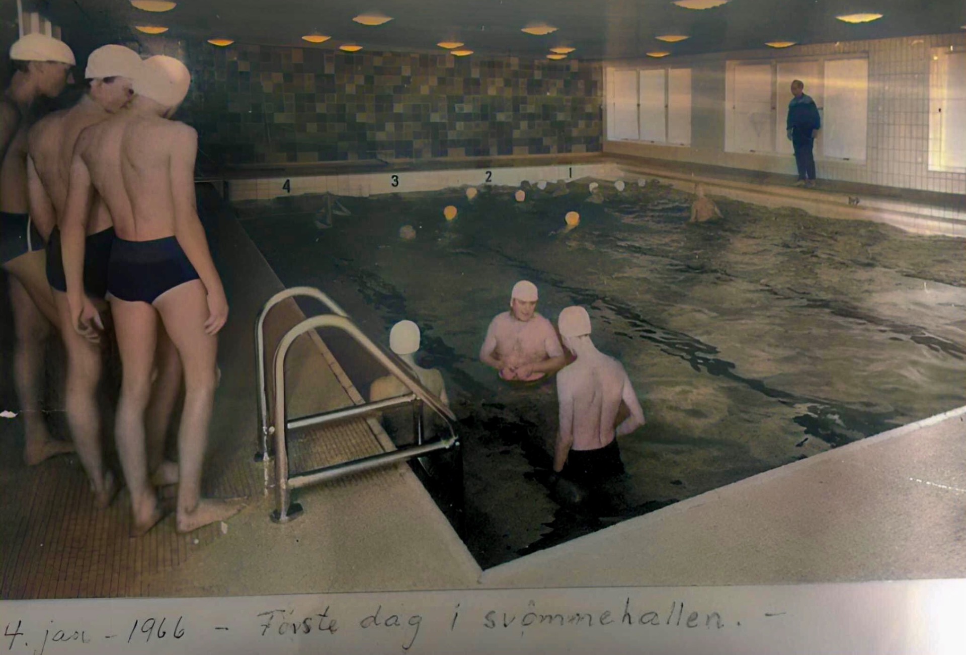 Vi ser såvidt ned på bygget som husa svømmehallen. Bygget med svømmehall og gymnastikksal stod ferdig i 1966. For ein som hadde vassa på nomestranda to ganger og tråkka rundt i bassenget på Dagsrud fire ganger, blei svømmeundervisninga på Ulefoss ein tøff overgang. Mor mi trur jeg ikke kunne svømme. Jeg så aldri at ho prøvde. Far min holdt på å drukne i Frognerbadet tidlig i 50 åra og blei aldri badeløve etter det! Nå gjekk vår svømmelærer langs bassengkanten med ei isoporplate som jeg skulle svømme etter. Mitt problem va at jeg ikke kunne svømme! Hver gang jeg trudde jeg fekk tak i den j*@# plata, blei ho tatt bort. Jeg gjekk under å svelga masse vann, men ikke nok te at jeg kunne stå på bånn! Jeg tok ikke skrekken og samma sommaren lærte jeg å svømme i Kastebukta sammen med gode kompisar. Heilt uten isoporplate!