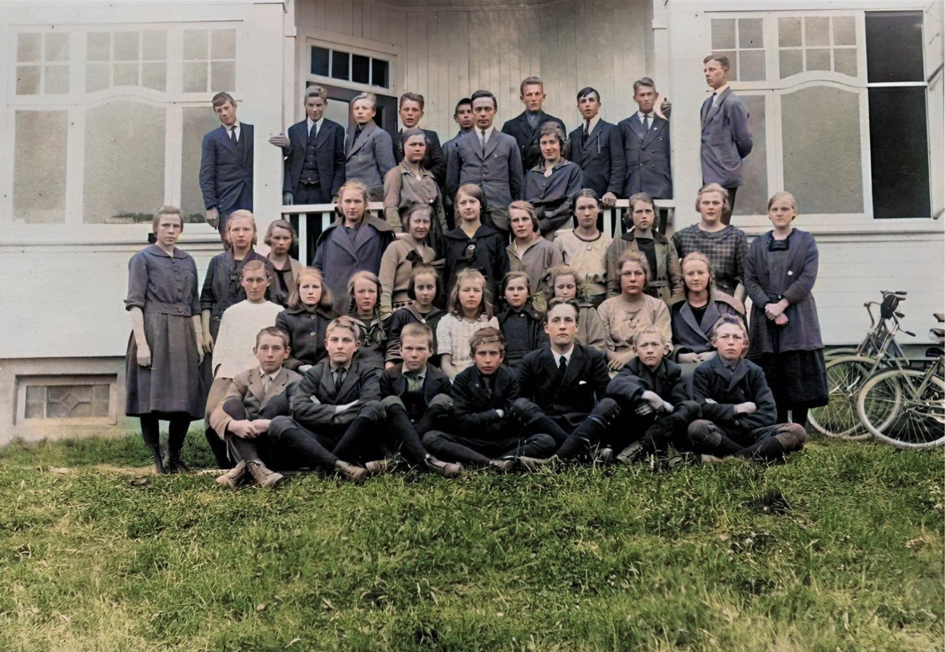 Klasserommet te mi klasse. Da vinteren kom, kunne vi se Diderik Cappelen over jordene på ski. Han kom heimafra Furustul og skulle ned på kontoret på jernverket. Han hadde alltid nikkers og lange ullstrømper, akkurat slik det skulle væra!