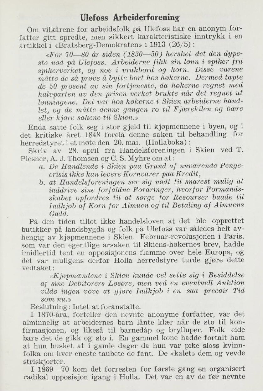 I 1868 dukker ulefoss med to s’er opp i avisene og kun gjennom reklame for «Ulefoss Jernværk». Sognet er konsekvent ført Holden. Lenger bakover i århundret finner vi at det blir ført Hollen, men kun heilt sporadisk. Holla blir i denna tida bare ført som vi i dag skriver hallo: «Holla, De der!» Er denna tidlige varianten av hallo kommi inn fra det spanske språk og fra ordet hola? Mye tyder på det!
