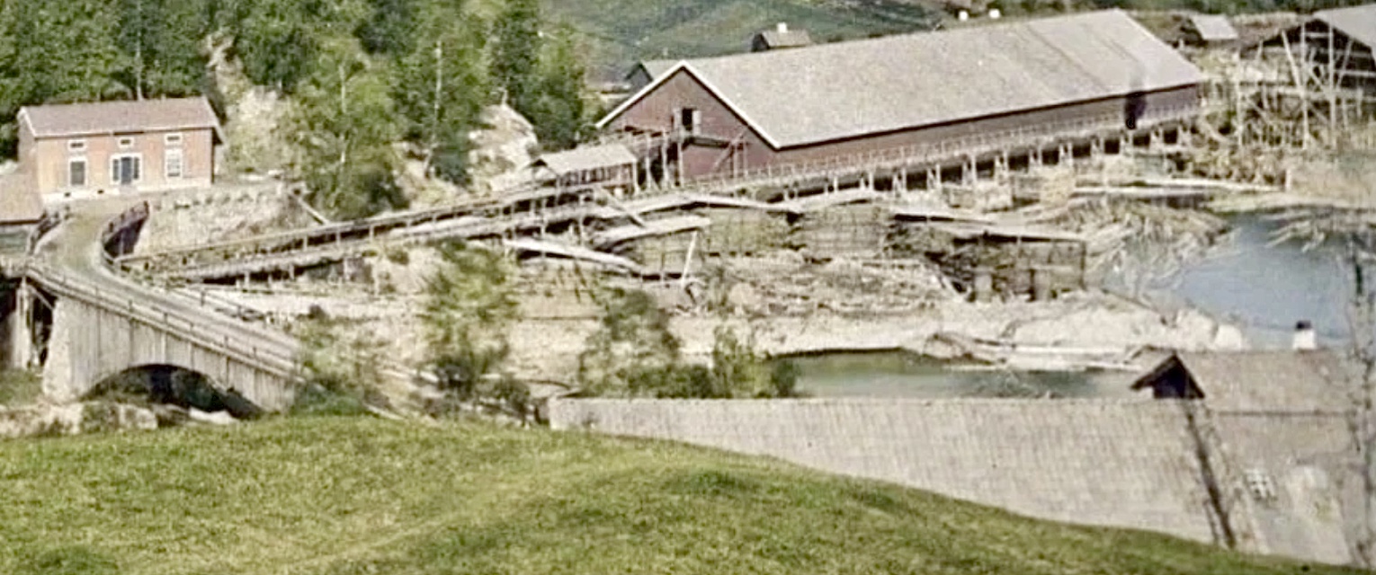 Vi ser ein bygning ved Tvara-bekken sitt utløp. Bygningane nærmast kan ha vært tørkehus for de skjærte materialene som kom fra sagbruket. Vannrenna nærmast gav vannkraft te jernverket.